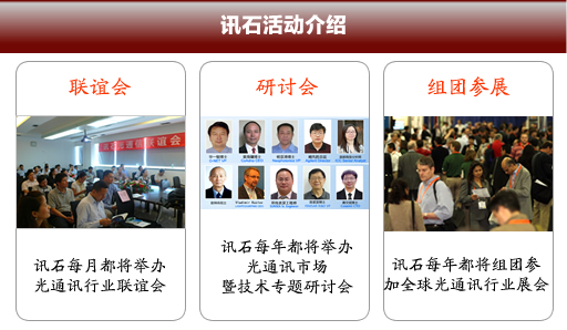 訊石信息咨詢(深圳)有限公司自成立以來,舉辦各類活動百余次,包括研討會、聯誼會、組團參展等,廣受業內人士好評。此外,訊石拜訪足跡遍布全球,為光通訊企業搭建溝通和交流的良好平臺。“活動會友”成為訊石的特色,訊石將繼續發揚這一優勢,更好的服務客戶!