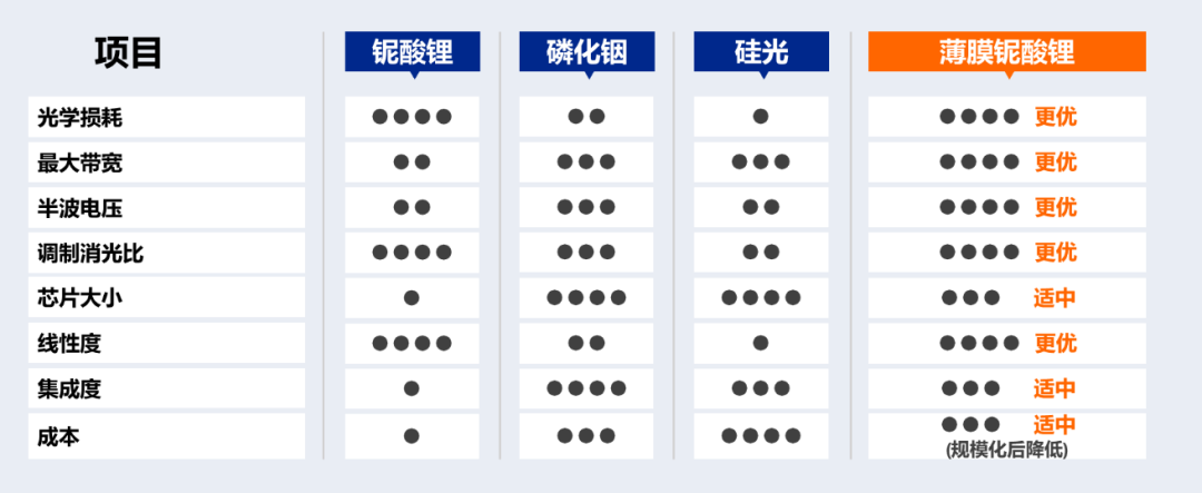 相較于磷化銦、硅光和傳統的鈮酸鋰等材料,薄膜鈮酸鋰憑借其超快的調制速度和高集成度,展現出顯著的優勢。薄膜鈮酸鋰具備超高帶寬、低功耗、低損耗、小尺寸,以及可實現晶圓級大批量生產等突出特點,這使它成為光電調制器的理想材料。