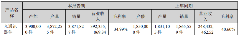 2024年,公司光通訊器件生產量、銷售量分別較上年增長 111.47%、107.54%,主要是數據中心需求激增,公司通過技術創新、推出新產品、積極拓展國內外市場,光通訊器件訂單相應增加所致。公告指出,2024年公司光通訊器件產能較上年同期增加 205 萬件,上漲 110.81%,產量較上年同期增加 204.12 萬件,上漲111.47%,銷量較上年同期增加 200.63 萬件,上漲 107.54%,營業收入較上年同期增加 14,392.26 萬元,上漲 57.93%,毛利率較上年下降 5.61%。