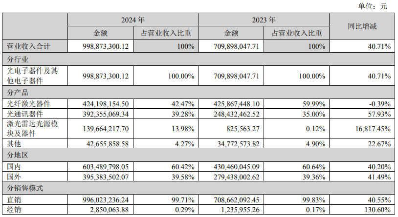 2024年,公司光纖激光器件生產量、銷售量分別較上年增長 6.34%、3.73%,主要是公司通過技術創新、推出新產品、積極拓展國內外市場,光纖激光器件訂單增加,產銷量增長所致。本報告期末光纖激光器件庫存量較上年下降 6.26%,本報告期末庫存量處于合理水平。