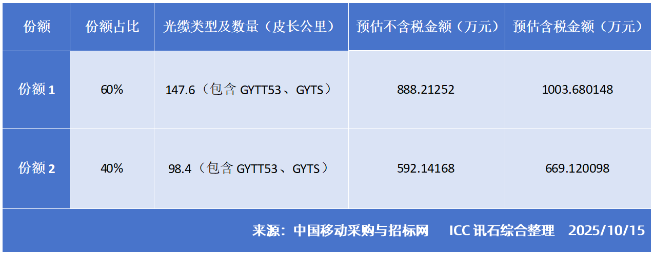 據了解,本項目采購2025年至2026年24芯-132芯普纜+兩芯空芯的混合光纜及輔材,預估數量為246皮長公里,共劃分1個標包2個份額: