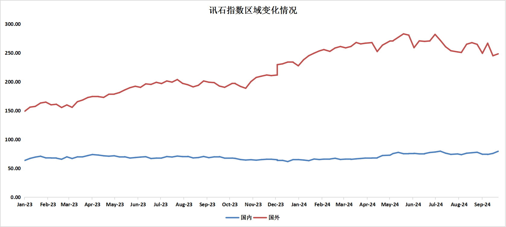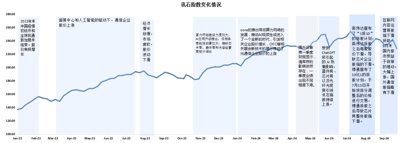ICC訊 截止到9月26日,訊石統(tǒng)計(jì)的指數(shù)值為227.46,比上月的241.02下滑13.56,9月市場整體呈現(xiàn)先下滑趨勢,下滑主要是互聯(lián)網(wǎng)內(nèi)容運(yùn)營商股指下滑所致。9月末國內(nèi)股市受益于政策的推動(dòng),大幅上漲,國外通信股指略有下滑,主要是國外互聯(lián)網(wǎng)內(nèi)容運(yùn)營商股指下滑所致。蘋果公司發(fā)布了新的iphone 16,交期縮短,但需求遇冷,股價(jià)小幅下滑。整體來看,訊石指數(shù)9月較上月呈現(xiàn)下滑趨勢。
