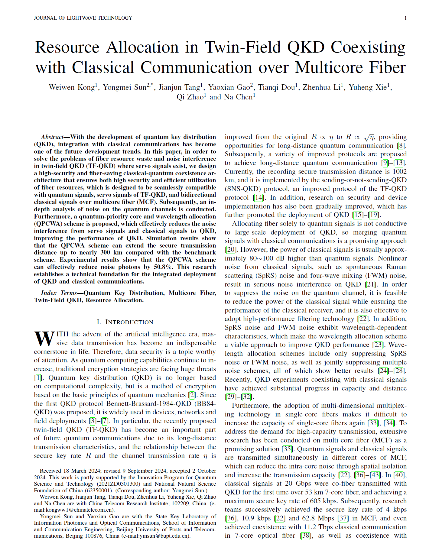 ICC訊 近日,中國電信研究院聯合北京郵電大學,在國際上首創提出了經典通信與雙場QKD共纖傳輸架構與方案,成功解決了經典通信與雙場QKD共纖傳輸過程中噪聲干擾嚴重的難題。該成果憑借其高安全性、大容量以及遠距離傳輸等優勢,已被國際頂級光學期刊《IEEE Journal of Lightwave Technology》(JLT,SCI一區)錄用發表,由研究院孔維文,唐建軍,竇天琦,李振華,解宇恒,趙琦,陳娜等共同完成。目前,該成果是國內運營商首篇量子通信領域SCI一區論文。