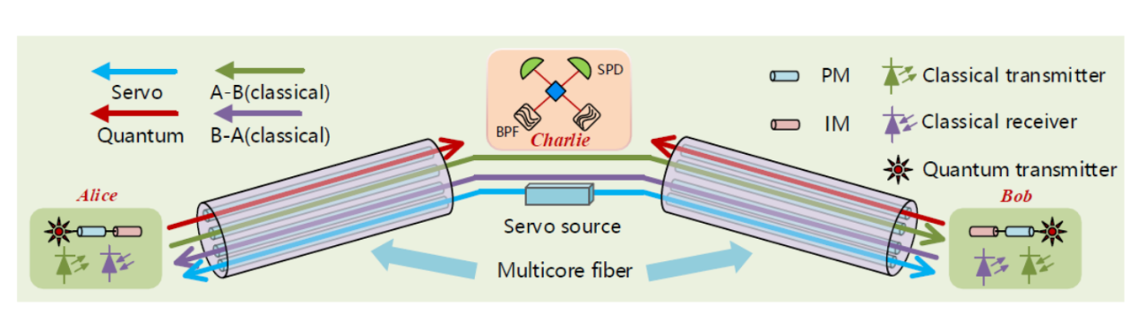 為解決這一難題,中國電信研究院聯合北京郵電大學采用空分復用技術,并設計了創新性的空頻雙維資源分配方案,有效降低了經典信號對量子信號的噪聲影響。研究團隊設計了一種基于多芯光纖的共存經典通信和雙場QKD傳輸系統,該系統利用多芯光纖的不同纖芯分別傳輸雙向經典信號、量子信號和伺服信號。同時,空頻雙維資源分配方案從纖芯和波長兩個維度入手,成功降低量子通信中約50.8%噪聲干擾。實驗與仿真平臺結果顯示,該方案最高可將成碼率提升近10倍,為后續實現高安全、大容量、遠距離的QKD網絡提供了重要參考。