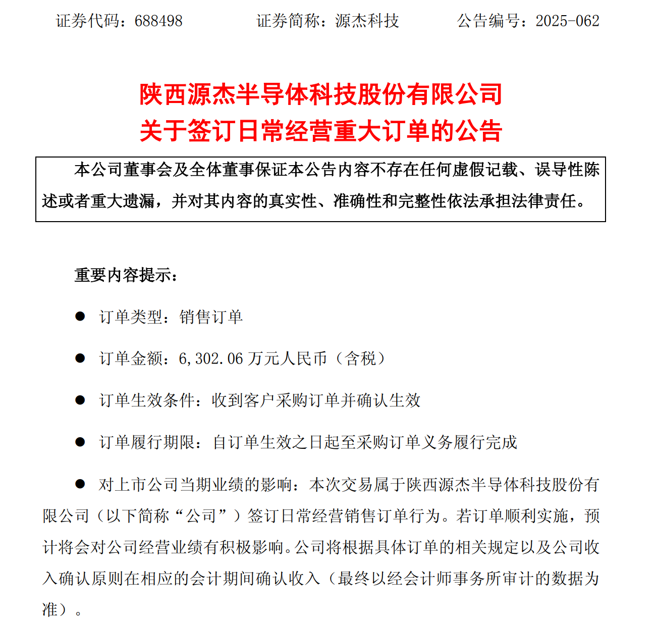 ICC訊 10月20日,陜西源杰半導體科技股份有限公司(簡稱源杰科技,股票代碼:688498)發布公告,公司近日收到 A 客戶關于大功率激光器芯片產品的采購訂單,訂單總金額為6,302.06 萬元人民幣(含稅)。該等訂單為公司日常經營性訂單,若訂單順利實施,預計將會對公司經營業績有積極影響。