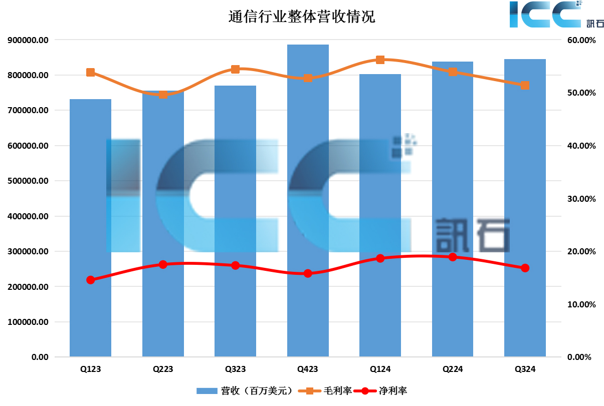 ICC訊 2024年三季度ICC訊石追蹤統計的100 家通信行業上市公司合計實現整體營收為8446.93億美元,2023年三季度通信行業整體營收為7704.76億美元,同比增長9.63%;2024年三季度毛利率為51.38%,與去年同期相比下滑3.05%;凈利率為16.84%,與去年同期相比下滑0.48%。其中器件商和芯片商業績表現亮眼,AI 技術的快速發展帶動相關器件商和芯片商需求持續增長?;ヂ摼W內容運營商收入保持穩定。電信運營商營收增速放緩,面臨挑戰。設備商通過技術創新和市場調整,展現出一定的盈利能力和市場競爭力。光纖光纜商在2024年三季度顯示出一定的增長趨勢,特別是在與AI和數據中心相關的領域。同時,海外市場的需求變化對光纖光纜商業績有顯著影響,預計未來隨著技術的發展和全球市場的復蘇,對光纖光纜的需求將進一步增長。
