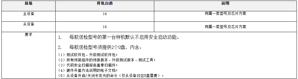 FTTR主設備和從設備應同時提供樣品。如有不同芯片方案的產品應各提供1款樣品進行檢測,并標明檢測順序。每款樣品的樣機數量及相關要求見下表: