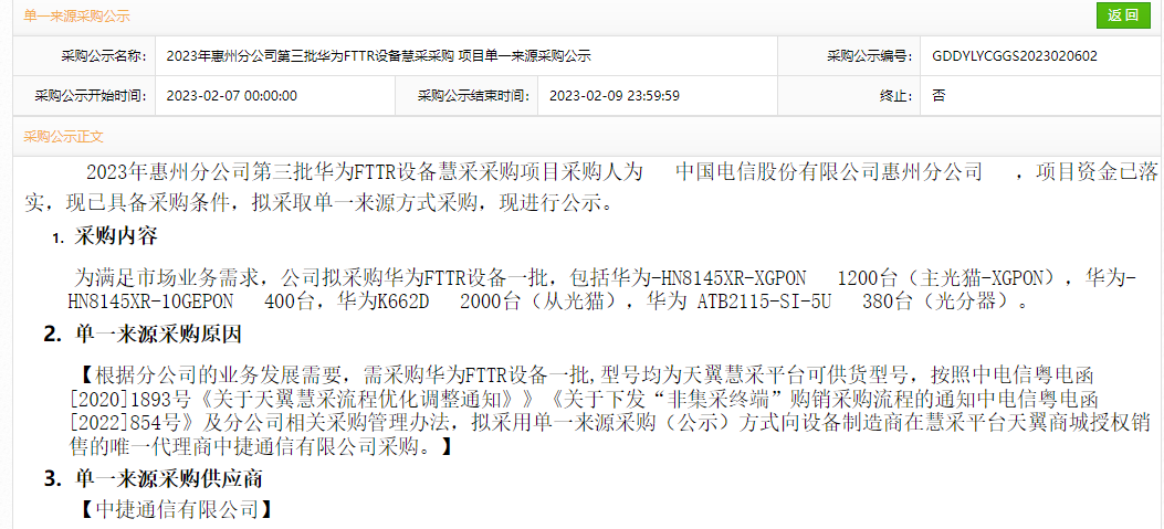 根據分公司的業務發展需要,需采購華為FTTR設備一批,型號均為天翼慧采平臺可供貨型號,按照中電信粵電函[2020]1893號《關于天翼慧采流程優化調整通知》》《關于下發“非集采終端”購銷采購流程的通知中電信粵電函[2022]854號》及分公司相關采購管理辦法,擬采用單一來源采購(公示)方式向設備制造商在慧采平臺天翼商城授權銷售的唯一代理商中捷通信有限公司采購。