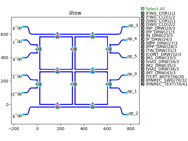 - 實例化MZI組件,并使用Linked類進行波導路由連接它們。