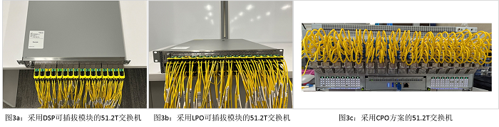 圖3a、3b、3c分別展示了Broadcom實(shí)驗(yàn)室中的三種系統(tǒng)配置:(a)采用800Gbps DSP可插拔模塊,(b)采用800Gbps LPO可插拔模塊,(c)采用Bailly CPO方案。經(jīng)測(cè)試對(duì)比發(fā)現(xiàn):