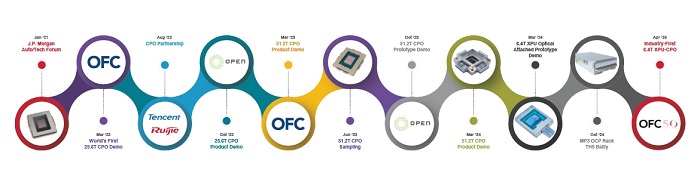 XPU-CPO是Broadcom在該領(lǐng)域長(zhǎng)期技術(shù)領(lǐng)先的最新成果。例如,Broadcom于2023年率先展示并量產(chǎn)了集成3.2Tbps光學(xué)引擎的Tomahawk 4-Humboldt全功能CPO交換機(jī)。基于此成功經(jīng)驗(yàn),公司在2024年推出Tomahawk 5-Bailly,將共封裝通道數(shù)從128提升至512,每個(gè)光學(xué)引擎密度達(dá)到6.4Tbps,至今保持行業(yè)最高記錄。在此過(guò)程中,Broadcom持續(xù)公開技術(shù)進(jìn)展以推動(dòng)行業(yè)對(duì)這一基礎(chǔ)技術(shù)的投入。圖1展示了自2021年公布計(jì)劃以來(lái)的CPO技術(shù)演進(jìn)路線。