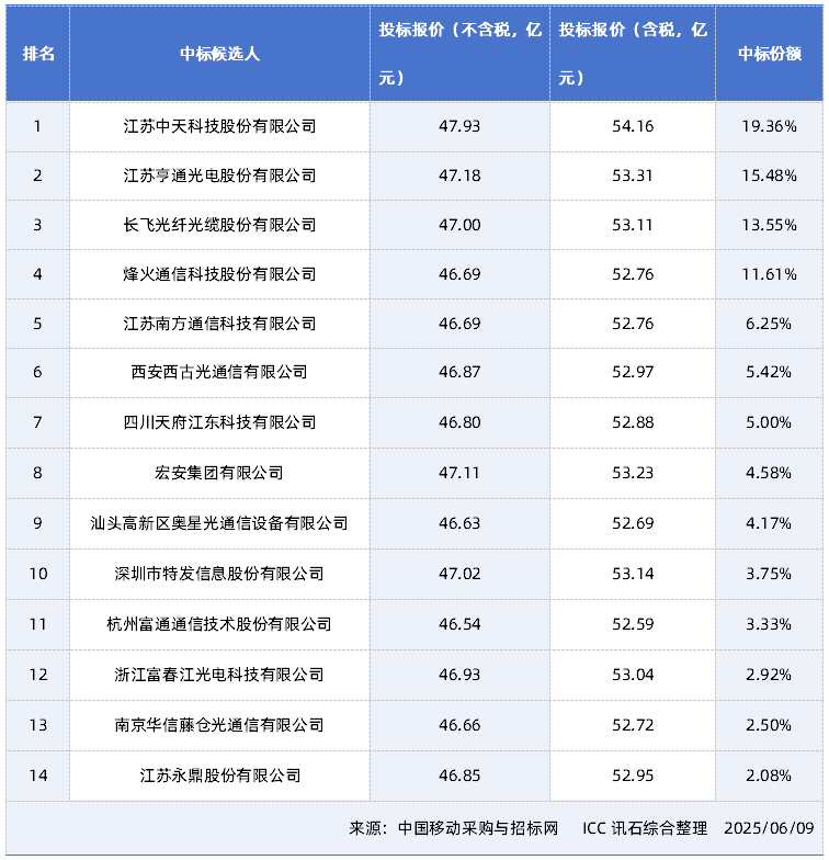 ICC訊 2025年6月7日,中國移動于采購網發布了《2025年至2026年普通光纜產品集中采購項目中標候選人公示》。本次集采規模達320.68萬皮長公里(折合9884萬芯公里),最高投標限價為567,522.81萬元(不含稅)。最終共14家廠商中標,平均不含稅報價約47億元,較限價降幅顯著。