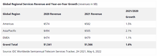 ICC訊(編譯:Nina)根據IDC全球電信服務半年度跟蹤報告,2021年全球電信服務和付費電視服務支出達到15660億美元,年增幅1.6%。IDC預計,2022年全球電信和付費電視服務支出將增長1.4%,達到15880億美元。