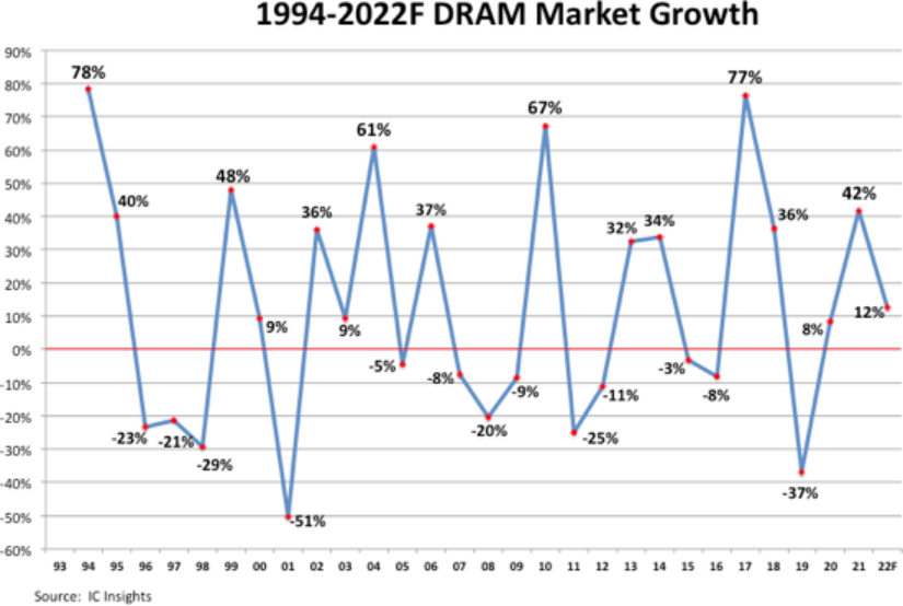 ICC訊 當地時間 5 月 24 日,IC Insights 根據《麥克林報告》摘編稱,在過去 30 年中,DRAM 市場的特點是經歷了驚人的增長時期和毀滅性的崩潰年份。近年來,DRAM 市場在 2019 年下跌 37%,但在 2021 年飆升 42%。無論是什么原因,“繁榮、蕭條”的周期使主要的 DRAM 供應商的數量從 1990 年代中期的 20 家降至現在的 6 家。2021 年,三家最大的供應商三星、SK 海力士和美光總共占有 94% 的 DRAM 市場份額。總部設在韓國的三星和 SK 海力士去年占了全球 DRAM 銷售的 71.3%。