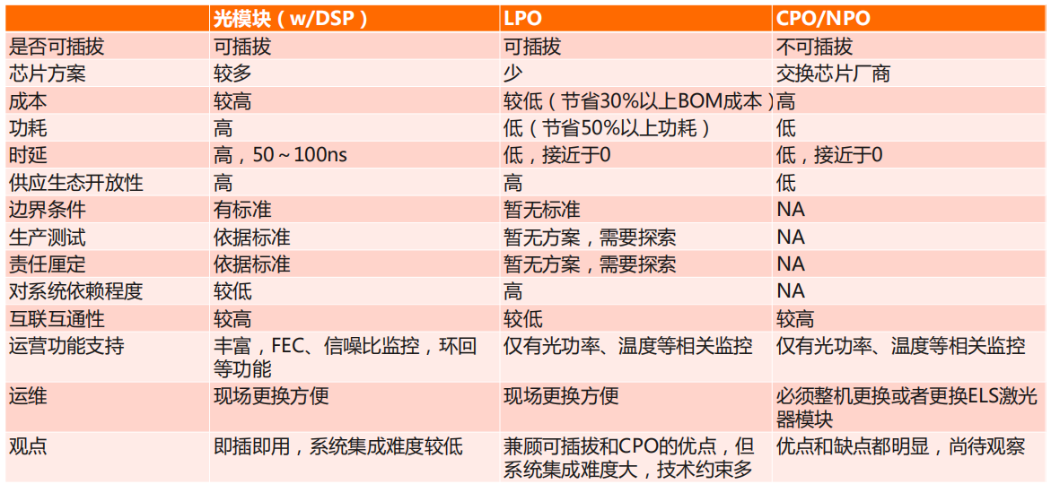 隨著交換機Serdes速率和數(shù)量的增加,現(xiàn)今,光模塊功耗占設(shè)備總功耗高達1/3。低功耗、低時延的光互聯(lián)技術(shù)更適合超算,陸睿對比了LPO/CPO/NPO技術(shù)的對比和選擇,他認為LPO優(yōu)點是兼顧可插拔和CPO的優(yōu)點,但系統(tǒng)集成難度大,技術(shù)約束多。CPO/NPO優(yōu)缺點都很明顯,尚待觀察。