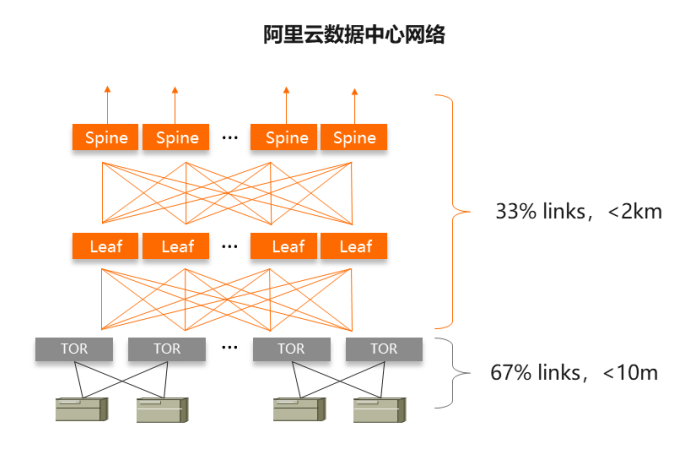 在阿里云數據中心網絡典型3層CLOS架構下,集群內用于Spine和Leaf以及Leaf和TOR之間互聯的網絡鏈路長度一般在2km以內,其中Leaf和TOR之間的互聯長度通常在100m之內。這些需要短距和長距光模塊連接的鏈路數量,占到整個集群內總物理鏈路數量的1/3;而從服務器網卡接至TOR的鏈路長度通常在10m之內,但是其鏈路數量則占到了總物理鏈路數的2/3,通常使用DAC或AOC來連接。
