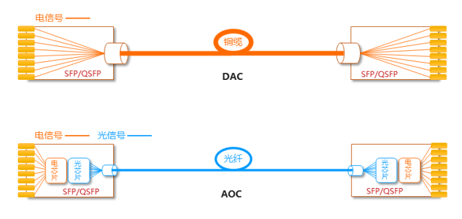 AOC和DAC兩者在兩端的模塊封裝上采用相同外形和電界面,如SFP、QSFP等各種標準,確保和系統側(交換機、NIC等)的標準接插。
