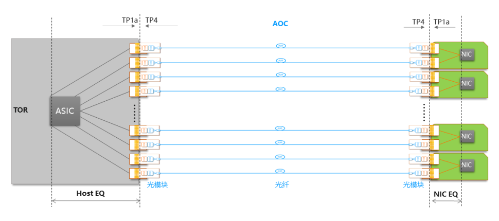 1. 標準界面,即插即用。針對AOC光模塊的應用,以可插拔模塊和系統端口處為一致性目標點(TP1a和TP4),因此,在交換機“黑盒”時代,只要交換機所有端口和光模塊都滿足TP1a和TP4的電信號規格,AOC便可以即插即用。中間光信號的傳輸在模塊之間閉環,系統用戶也無需關心。