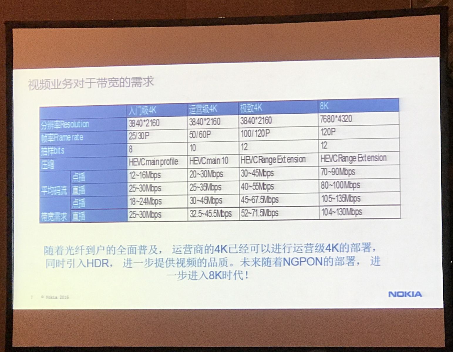 “諾貝爾”演講嘉賓就在演講中提到:提升客戶體驗(yàn),固網(wǎng)需更好支持4K/8K等視頻業(yè)務(wù)。并認(rèn)為4K/8K是運(yùn)營商發(fā)展的新驅(qū)動(dòng)力,8K和4K絕不僅僅是單純的分辨率上的提升,同時(shí)還有色彩還原和動(dòng)態(tài)范圍幾個(gè)維度的提升,將給觀眾觀看視頻等帶來明顯的沉浸感。視頻的下一步體驗(yàn)是8K UHD,8K視頻的分辨率為7680*4320,是4K視頻的4倍,而超高清電視的優(yōu)點(diǎn)是非常強(qiáng)的臨場感和實(shí)物感。