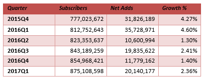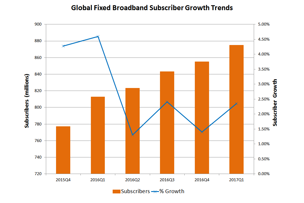 ICCSZ訊(編譯:Vicki)Point Topic 公布了2017 Q1季度的的寬帶用戶(hù)數(shù)據(jù)。Q117全球固網(wǎng)寬帶用戶(hù)數(shù)量環(huán)比增長(zhǎng)2.63%。固網(wǎng)寬帶用戶(hù)總數(shù)為8.751億。