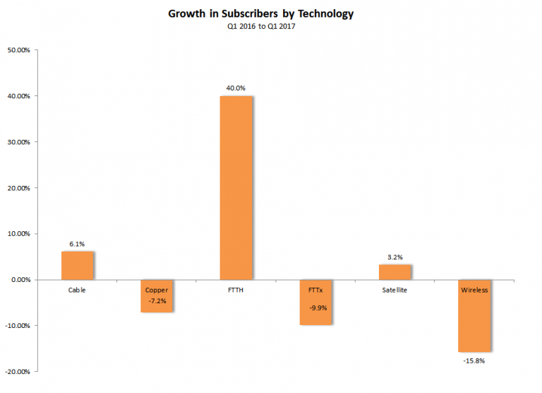 在年度變化方面,全球的銅線(xiàn)數(shù)量下降了7%, 而FTTH用戶(hù)數(shù)在2016年第一季度到2017年第一季度之間上升了40% (圖6)。這個(gè)數(shù)字與之前一個(gè)季度相比略有所下降,但是光纖替代銅線(xiàn)的趨勢(shì)依然明顯。FTTX的負(fù)增長(zhǎng)主要是由于FTTH在中國(guó)大規(guī)模的替代了FTTX.同時(shí),固定的無(wú)線(xiàn)技術(shù)在逐漸的給基于4G LTE的移動(dòng)寬帶接入鋪路。實(shí)際上,在一些國(guó)家和地區(qū)這被認(rèn)為是一種提供家庭連接寬帶的方式,例如斯堪的納維亞和東歐。