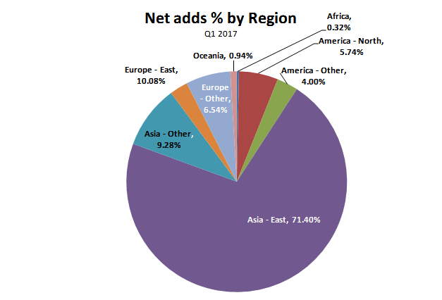 在2017年第一季度,固網(wǎng)寬帶的凈增加額的71% 來(lái)自東亞,高于2016年第四季度的49%(圖3)。該地區(qū)的季度增長(zhǎng)率是所有地區(qū)中最高的,增長(zhǎng)率為3.9% (圖4)。