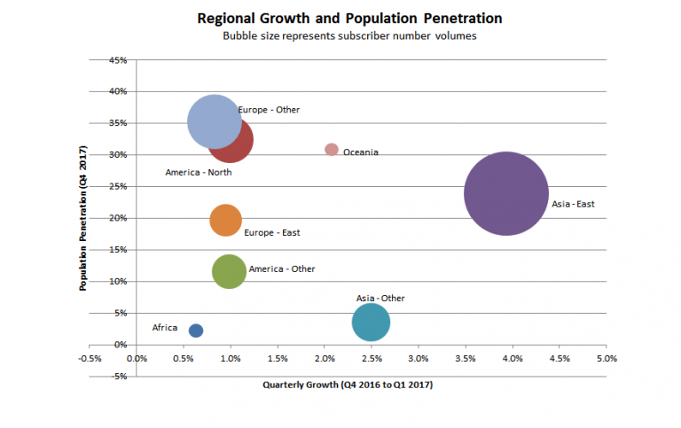 圖4 各區(qū)域的滲透率和季度增長(zhǎng)率(圓的大小代表了2017年第一季度的用戶(hù)數(shù)量)