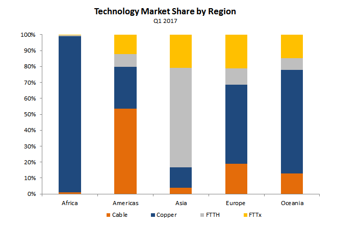 銅線(xiàn)技術(shù)的應(yīng)用(DSL, ADSL和ADSL2+)在用戶(hù)總數(shù)的份額中,所有地區(qū)都有所下降。2017年的第一季度,歐洲和大洋洲包括VDSL在內(nèi)的FTTH和FTTX開(kāi)始獲得更多的份額,歐洲和大洋洲銅線(xiàn)技術(shù)應(yīng)用的跌幅尤為明顯。這兩個(gè)地區(qū)的銅線(xiàn)技術(shù)應(yīng)用環(huán)比下降了2.1% (圖5)。