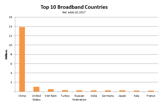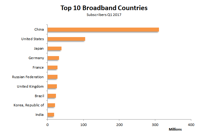 圖7 2017 Q1 排名前十的國(guó)家的寬帶用戶(hù)數(shù)