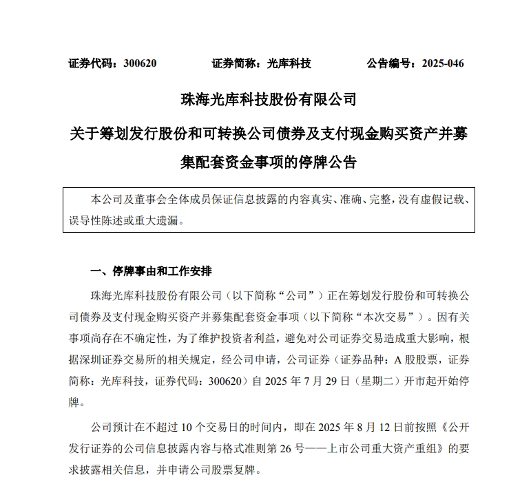 ICC訊 珠海光庫科技股份有限公司(證券代碼:300620,簡稱“光庫科技”)7月28日晚間公告,公司正在籌劃通過發(fā)行股份、可轉換公司債券及支付現(xiàn)金的方式,收購蘇州安捷訊光電科技股份有限公司(簡稱“安捷訊”)的控股權,并同步募集配套資金。為確保交易順利進行,公司股票自7月29日開市起停牌,預計停牌時間不超過10個交易日,最晚將于2025年8月12日復牌。