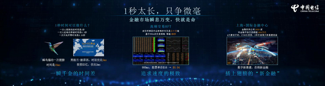 上世紀90年代,上海證券交易所開業第一天,就進入了電子競價時代,而當時,國際上發達國家的交易所,不少還流行著手勢喊話的口頭競價方式。金融交易需要極低時延保障,當前交易的競爭已從毫秒競爭到微秒,以便快速成交,鎖定利潤。為更好地服務金融交易,上海電信不斷追求極致低時延,結合覆蓋全市的775萬芯公里光纜為依托,將市區內300多個業務節點和集團覆蓋128個城市的OTN精品網融為一張網。在這張網絡中,交易指令直達上證所、上交所、中金所,深交所,大商所,鄭商所等國內和國際交易中心,為金融業客戶提供超快開通,帶寬隨選,超低時延,超大速率,超高可靠,超廣覆蓋,業務可視,云網一體的專線產品。