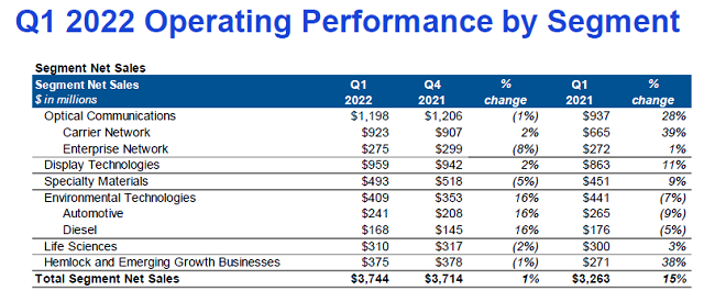 康寧董事長兼首席執行官Wendell P. Weeks表示:“得益于我們所有業務的強勁表現,尤其光通信業務銷售收入同比增長28%以及顯示業務的持續較好定價,我們在2022年迎來了一個出色的開端。第一季度,公司銷售收入同比增長15%,每股收益增長最快,達到20%。我們成功應對了復雜的地緣政治和外部運營環境,我們的創新和調價行動也幫助提高了盈利能力。展望未來,客戶對康寧的需求從未像現在這樣強勁。隨著我們推進創新并繼續專注于定價、資本效率和產生現金,我們預計今年的收入和利潤將實現強勁增長。”