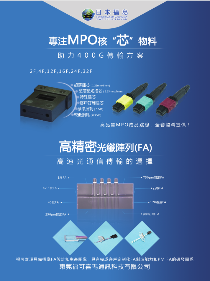 ICCSZ訊 9月3-4日,東莞福可喜瑪通訊科技有限公司(FSG)將攜MPO核“芯”物料及高精密光纖陣列(FA)等隆重亮相訊石第十七屆研討會,歡迎蒞臨訊石研討會期間,前往會場外走廊上的A06展位前來觀展交流。此外,9月5-8日,福可喜瑪還將隆重亮相CIOE,歡迎屆時前往展位號展位號1C75參觀交流!