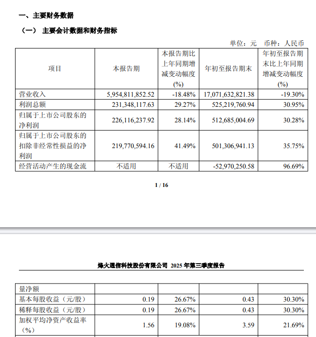 ICC訊 10月29日,烽火通信披露2025年三季報。烽火通信2025年第三季度實現(xiàn)營收59.55億元,同比下降18.48%;歸母凈利潤2.26億元,同比增長28.14%。2025年前三季度營收達170.72億元,同比下降19.30%;歸母凈利潤5.13億元,同比增幅達30.28%。
