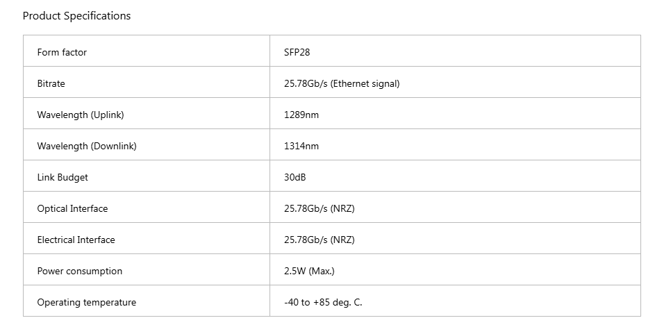 25G SFP28 80km BiDi光模塊具備以下特點: