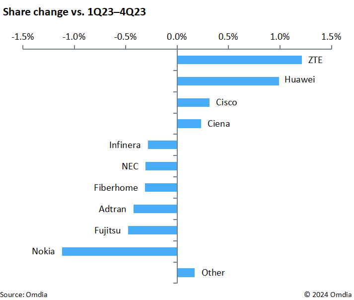 近日,全球權威分析機構Omdia發布《1Q24光網絡市場份額數據》。數據顯示,中興通訊光網絡在2023Q2至2024Q1期間的全球市場份額環比增速第一,這不僅是行業對其光網絡產品方案競爭力的高度認可,也彰顯了中興通訊光網絡在數字經濟浪潮中的堅實底座作用。