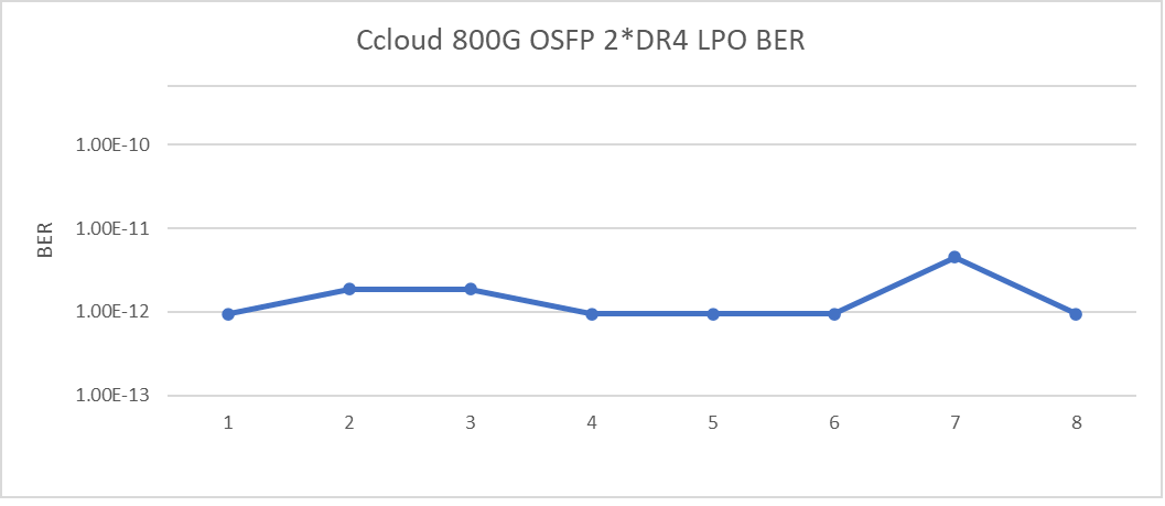 在客戶800G LPO交換機(jī)上,利用光模塊針對(duì)LPO交換機(jī)不同端口專門設(shè)計(jì)的自動(dòng)AGC功能調(diào)優(yōu)后,交換機(jī)直連端口發(fā)射眼圖良好,接收BER誤碼率測(cè)試表現(xiàn)優(yōu)異,接近或部分超越了傳統(tǒng)帶DSP功能模塊收端指標(biāo),客戶反饋相關(guān)測(cè)試數(shù)據(jù)如下:
