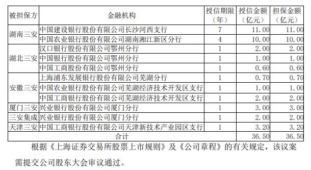 ·本次擔保金額:公司全資子公司湖南三安、湖北三安、安徽三安、廈門三安、三安集成和天津三安分別向金融機構申請綜合授信人民幣21.00億元、3.60億元、3.70億元、3.00億元、2.00億元和3.20億元,合計36.50億元。