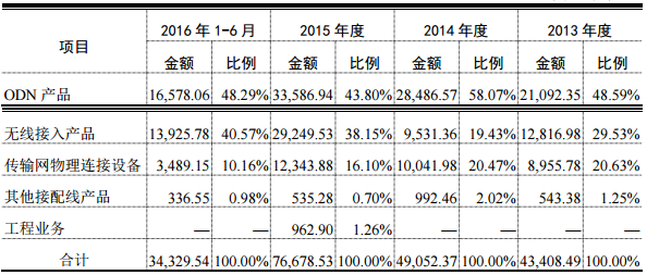 科信技術專注于FTTX 接入網、無線接入網和傳輸網中通信網絡物理連接設備及解決方案的提供,主要產品包括 FTTX 接入網ODN 系列產品、無線接入系列產品以及傳輸網相關產品等。公告給出了2016年1-6月各類產品銷售數據,其中ODN產品營收1.66億元,占比48.29%,無線接入產品營收1.39億元,占比40.25%,這兩類產品占據科信技術產品近9成的銷售額。