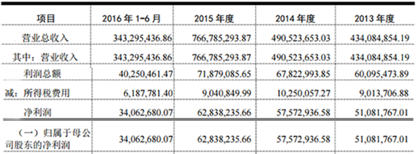 科信技術2016年1-6月營收3.43億元,毛利率37.27%,凈利潤3406.2萬元;2015年營收7.67億元,毛利率39.72%,凈利潤6283.8萬元;2014年營收4.91億元,毛利率33.15%,凈利潤5757.3萬元;2013年營收4.34億元,毛利率36.22%,凈利潤5108.2萬元。