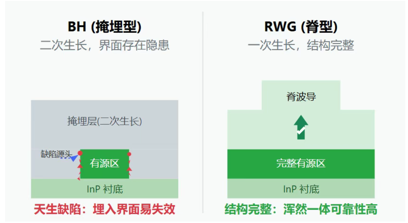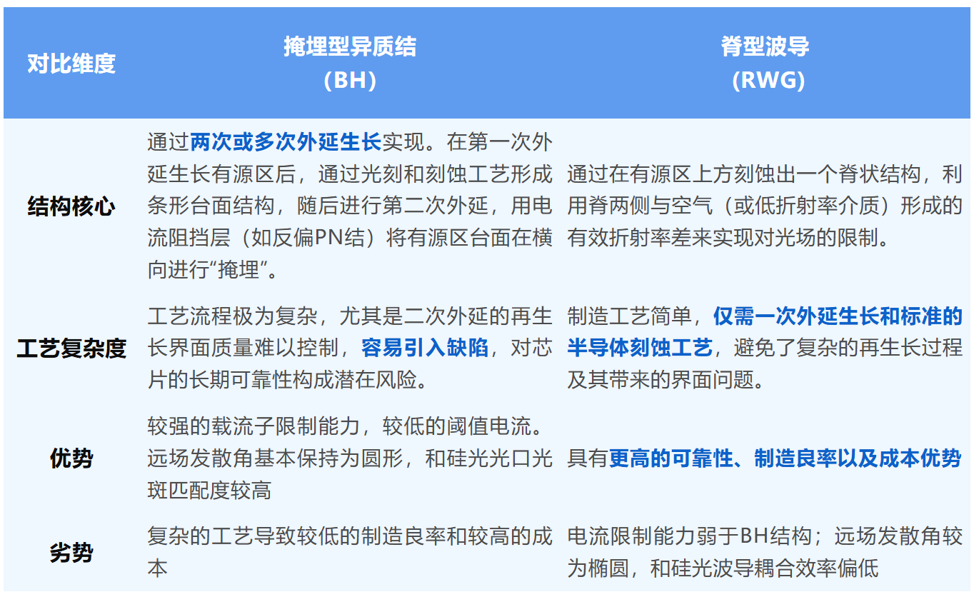 在CW DFB光源芯片中,為了實現穩定的單橫模輸出,必須引入有效的橫向光場和載流子限制結構。目前,掩埋型異質結(BH)和脊型波導(RWG)是業內兩種主流的波導結構設計,不同設計也決定了相應的激光器的性能、制造工藝和適用場景。以下列表對比說明兩種方案的優缺點: