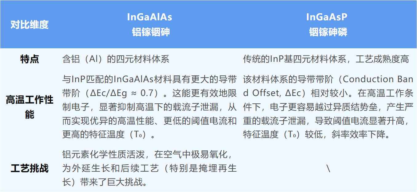 除了波導結構設計,有源區材料體系的選擇對激光器性能,尤其是高溫性能,起著決定性作用。目前,有兩種主流有源區材料:InGaAlAs (鋁鎵銦砷)和InGaAsP (銦鎵砷磷),下表對比了兩種材料體系的優缺點: