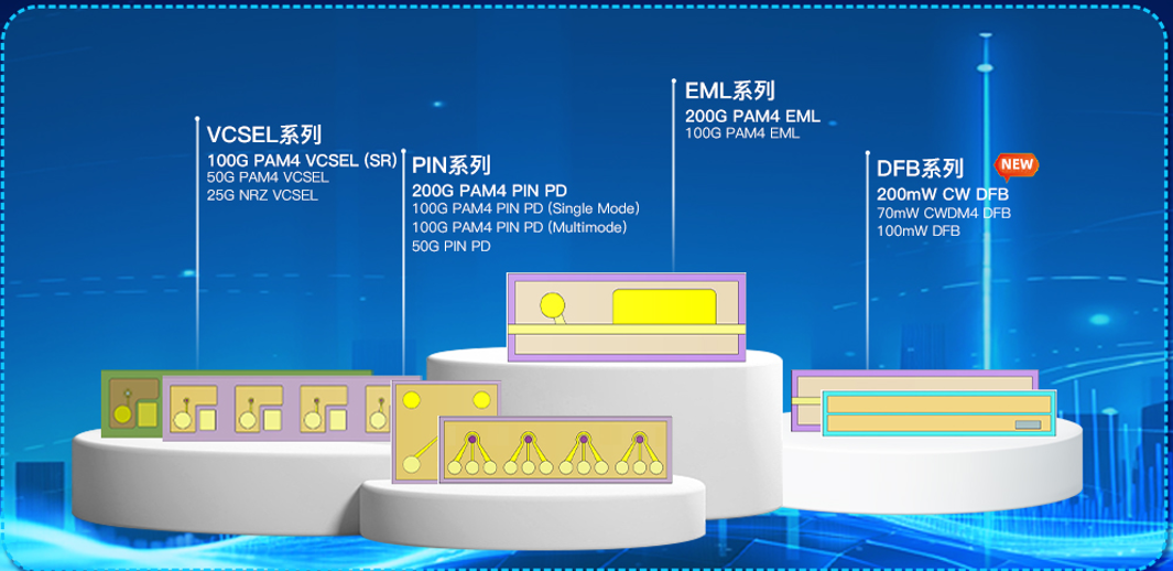 基于高功率半導體激光芯片領域十余年的技術積累,長光華芯沿用成熟的RWG設計和端面鈍化工藝開發了硅光光源芯片,解決了長期可靠性難題,現已成功推出寬溫 70mW/100mW/200mW等 CW DFB光源產品,持續為高速硅光模塊提供高性能光源解決方案!