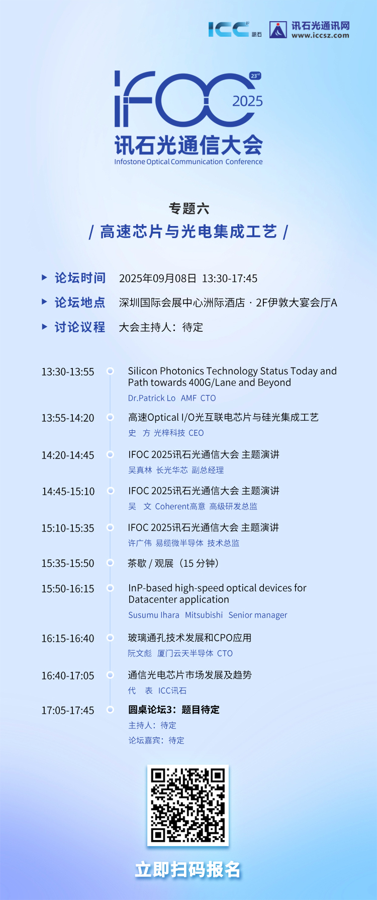 我們誠摯邀請光通信與半導(dǎo)體相關(guān)領(lǐng)域?qū)I(yè)人士報名參會,共商技術(shù)演進與產(chǎn)業(yè)合作。請掃描二維碼完成會議報名。
