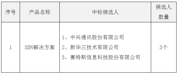 ICCSZ訊 12月13日,中國電信招標網公布2017年省級云資源池試商用SDN工程(一期)中標候選人,中興、新華三、賽特斯三家中標。詳情如下: