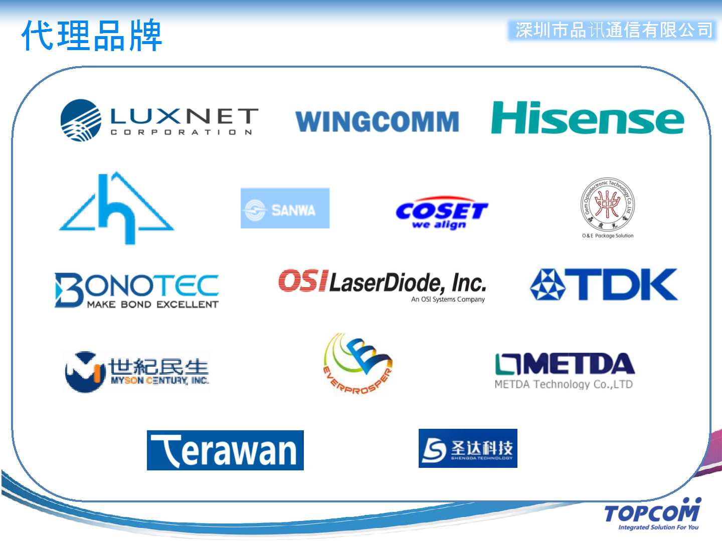 品訊通信成立于2011年,是一家以高科技產品代理銷售、市場推廣、售前售后技術服務為一體的企業,公司產品服務于光通訊有源光模塊、無源和光器件廠商、OTDR儀表以及數據存儲、云計算廠商,可提供Chip、TO、TOSA/ROSA、IC、MT插芯和MPO散件、100G誤碼測試儀、OTDR用激光器和探測器、粘合膠水、COB自動耦合平臺及TO管帽及陶瓷基板等產品。是的了,品訊通信就是一家典型的“代理商”。