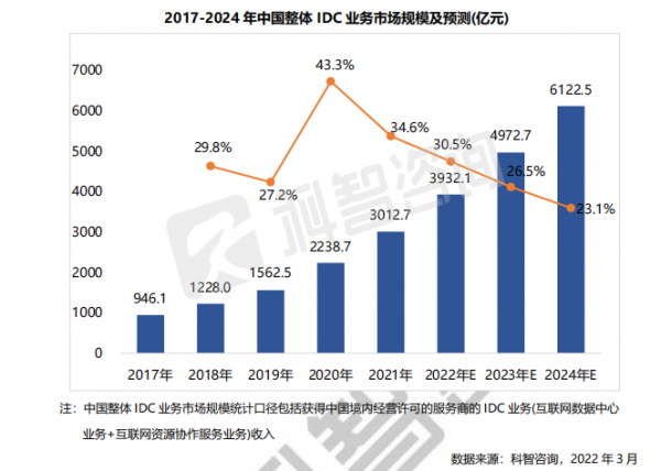 摘要:“2021年,中國整體IDC業務市場總體規模突破3000億元,達到3012.7億元,同比增長34.6%,相較于2020年的43.3%,增速有所放緩。