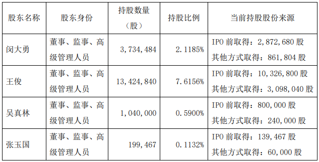 公告稱,公司近日收到股東閔大勇、王俊、吳真林、張玉國出具的《關(guān)于股東減持計劃的告知函》,因歸還貸款等個人資金需求,計劃自公司公告披露之日起 15 個交易日后的 3 個月內(nèi)通過集中競價、大宗交易方式減持公司股份。其中,閔大勇擬減持公司股份數(shù)量不超過 238,290 股,占公司總股本的比例不超過0.1352%,王俊擬減持公司股份數(shù)量不超過 255,320 股,占公司總股本的比例不超過 0.1448%,吳真林擬減持公司股份數(shù)量不超過 260,000 股,占公司總股本的比例不超過 0.1475%,張玉國擬減持公司股份數(shù)量不超過 49,866 股,占公司總股本的比例不超過 0.0283%。各股東本次擬減持股份數(shù)量占其個人本次減持前所持有公司股份數(shù)量的股份均不超過 25%。