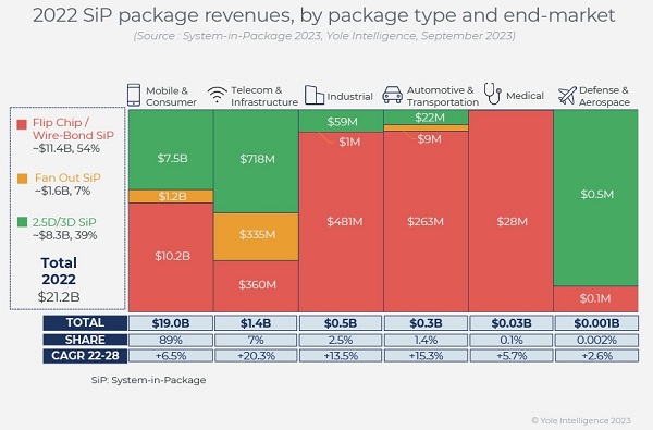 細分市場來看,移動和消費主導SiP市場,占2022年總收入的89%,且未來將繼續主導市場,年復合增長率為6.5%。驅動該細分市場的動力包括:2.5D/3D技術在手機、高端PC和游戲領域的日益普及,高端手機設備的高清FO,以及手機和可穿戴設備中更多的FC/WB SiP。電信和基礎設施市場預計將在未來幾年增長20.2%,驅動力包括AI、HPC和網絡領域不斷提高的性能要求。汽車市場正在以15.3%的年復合增長率增長,驅動力包括汽車電氣化和自動駕駛趨勢,也包括ADAS和LiDAR等應用,這些應用需求更多數量的傳感器和攝像頭。