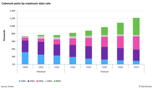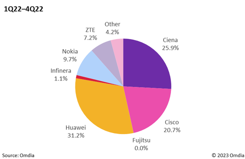ICC訊(編譯:Nina)近日,領先的技術研究公司Omdia發布了2022年第四季度(4Q22)100G+相干光設備端口數據,并深入分析了100G或更高速率WDM市場。報告顯示,與2021年相比,400G出貨量增長了55%,預計未來五年市場將保持高增長。過去四個季度(1Q22-4Q22),華為在400G出貨量方面保持領先。